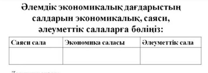 Әлемдік экономикалық дағдарыстың салдарын экономикалық, саяси, әлеуметтік салаларға бөліңіз: