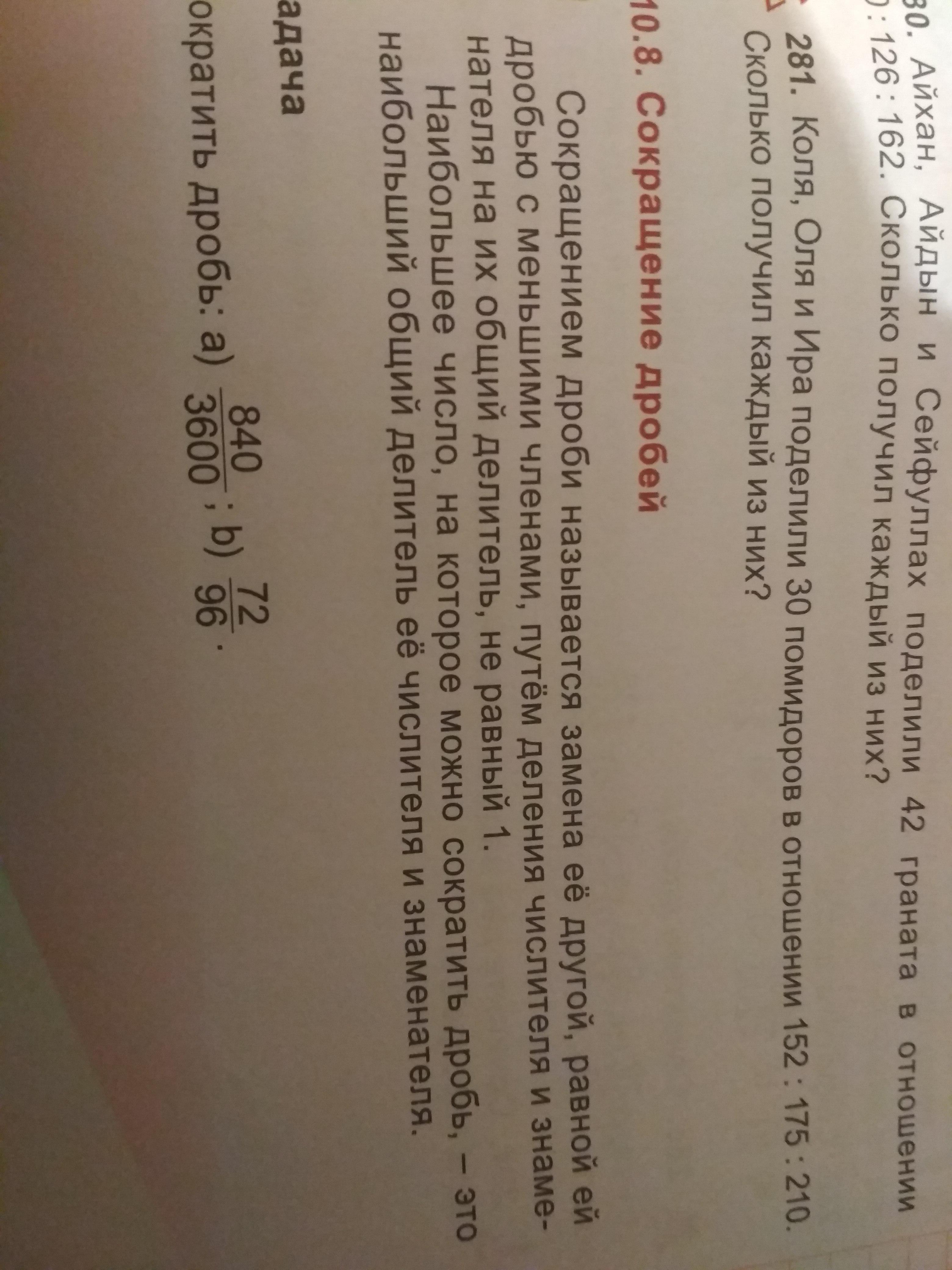 ОтвВсего частей 152+175+210=537 соответствуют 30 помидорам, тогда 30*152/537=≈8 шт Коля 30*175/537≈ 10 шт Оля 12шт Ира