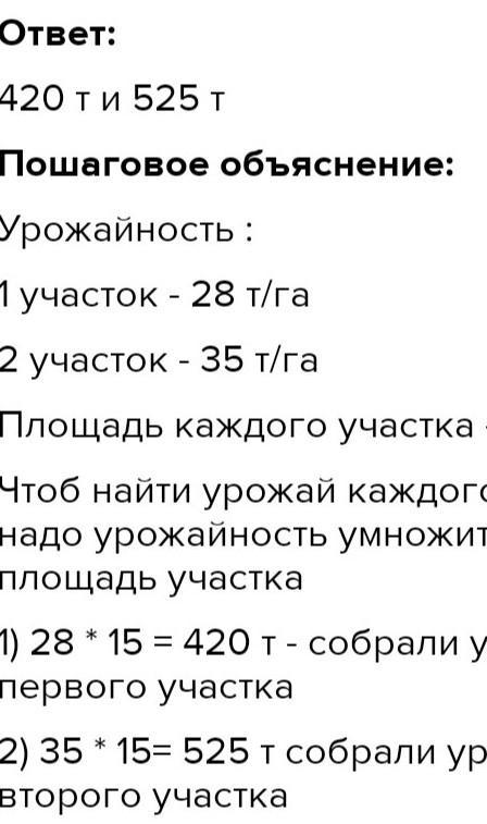 9. Реши задачу Ураждайность морковки на одном участке составляет 28 т/га,а на тругом-35т/га.какой урожай собрали на каждом участке,если под посадку было занято по 15 гектаров земли СРОЧНО !!!!!!