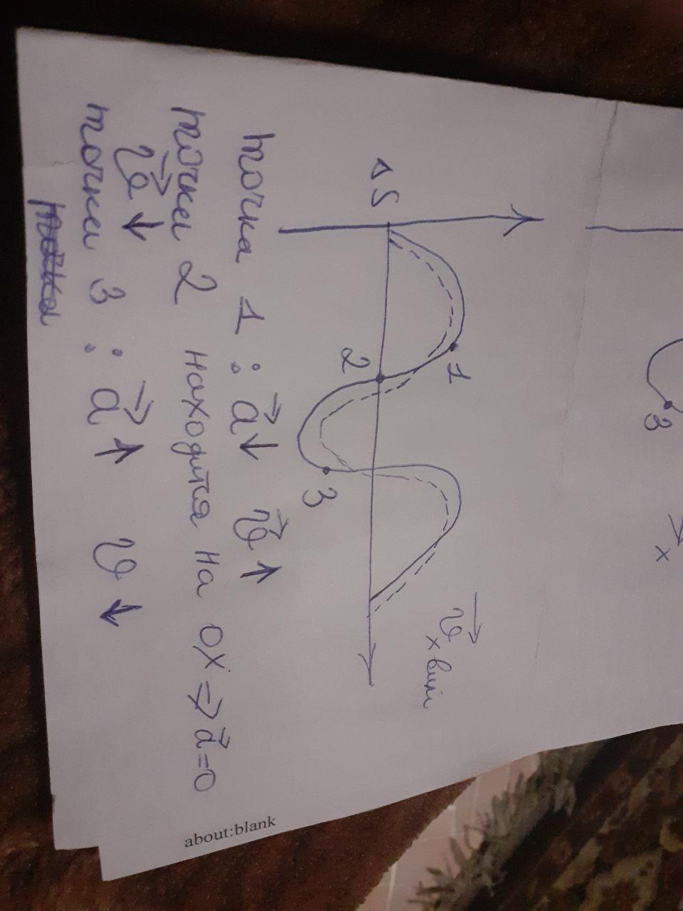 Графік поперечної хвилі, що поширюється праворуч, у певний момент часу має вигляд, як подано на рисунку. Визначте напрямками швидкості та прискорення руху частинок.
