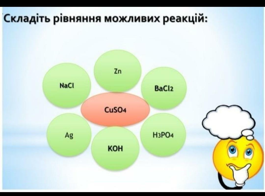 CuSO4:KOH,H3PO4,BaCI2,Zn,NaCI,Ag-они все реакции CuSO4