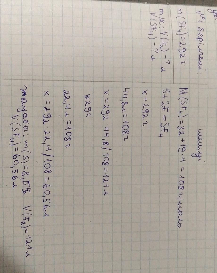 рассчитайте массу серы и объем газообразного фтора,необходимых для получения фторида серы массой 292г.Какой объем (н.у) займет полученный газ?