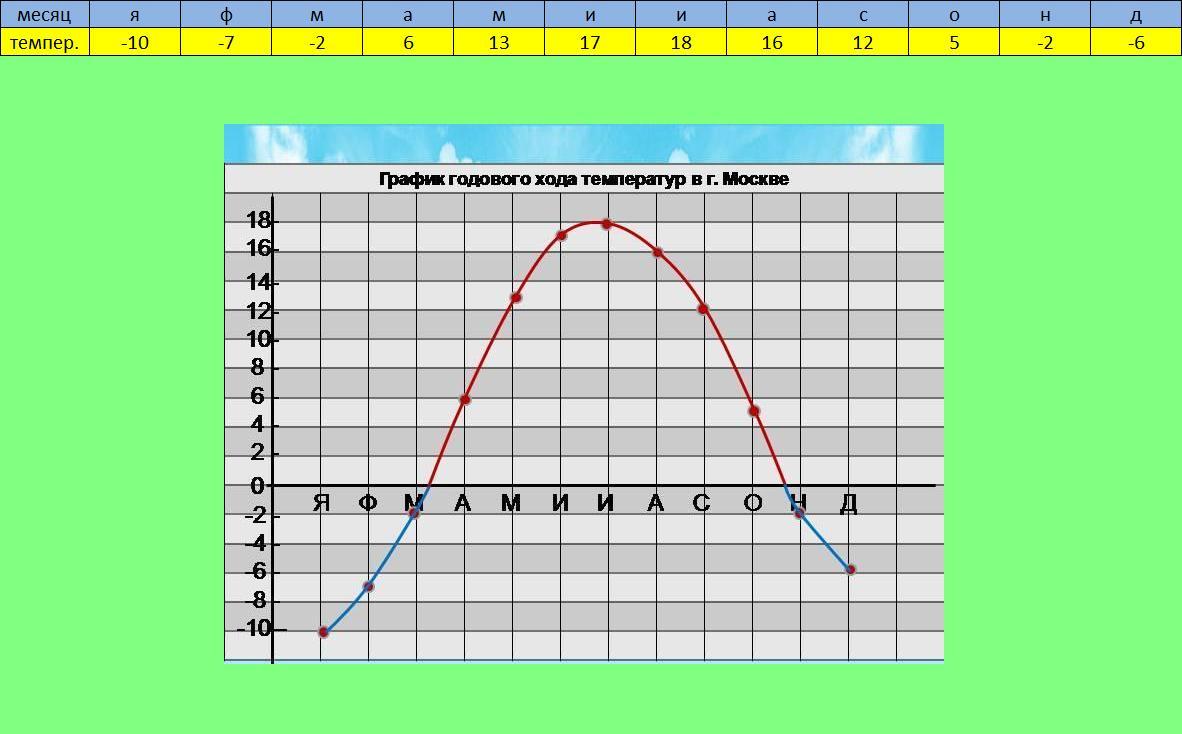 По графику определите среднегодовую температуру г. Москвы, и годовую амплитуду температур.