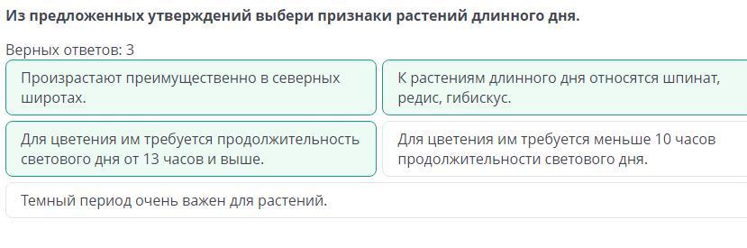 Из предложенных утверждений выбери признаки растений длинного дня.