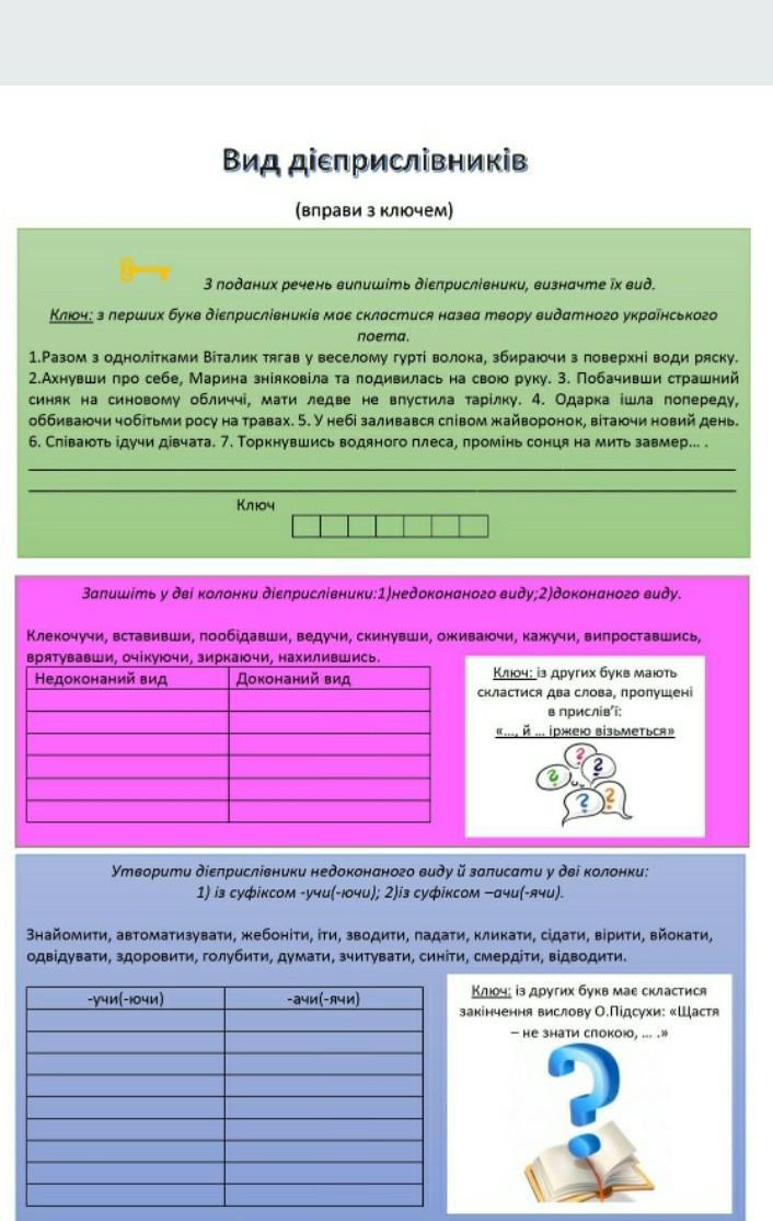 2) Недоконаний вид : Знайомлячи, автоматизуваючи ,жебонячи, зводячи, падаючи, кликаючи, сідаючи, вірячи, вйокачи, відвідавши, оздовивши, голубивши,думаючи,зчитуваючи, синіючи, смердячи, відводячи