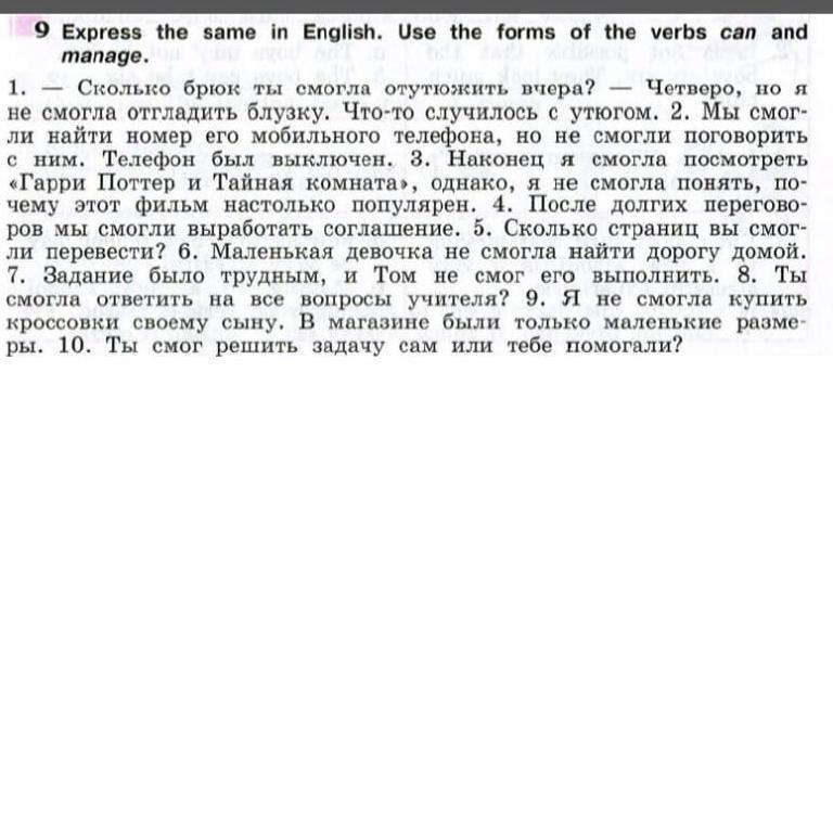 1. How many pants were you able to iron yesterday? Four, but I couldn't iron the blouse. Something happened to the iron. 2. We were able to find his mobile phone number, but could not speak to him. The phone was off. 3. Finally I was able to watch Harry Potter and the Chamber of Secrets, however, I could not understand why this film is so popular. 4. After long negotiations, we were able to work out an agreement. 5. How many pages could you translate? 6. The little girl couldn't find her way home. 7. The assignment was difficult, and Tom could not complete it. 8. Were you able to answer all the teacher's questions? 9. I could not buy sneakers for my son. The store only had small sizes. 10. Were you able to solve the problem yourself or were you helped?