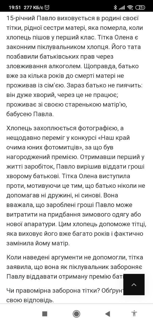 Також, частина 5, статті 32 Цивільного кодексу України встановлює норму, за якою: "За наявності достатніх підстав суд за заявою батьків (усиновлювачів), піклувальника, органу опіки та піклування може обмежити право неповнолітньої особи самостійно розпоряджатися своїм заробітком, стипендією чи іншими доходами або позбавити її цього права". Але, оцінюючи подану умову задачі, слід вказати, що у тітки немає достатніх аргументів для подання заяви до суду на рахунок обмеження Павла розпоряджатися своїм заробітком.