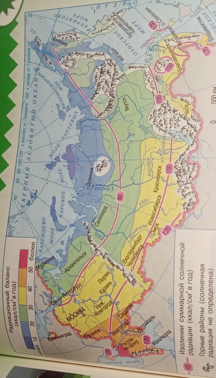 По карте на рисунке 42 определите суммарную солнечную радиацию для десяти городов России. Какой вывод вы сделали?