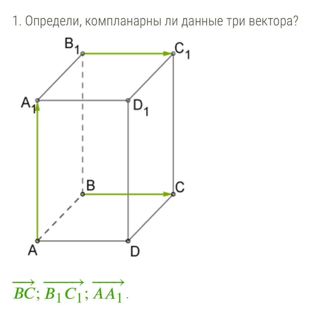 По определению компланарными называют векторы, которые лежат в одной плоскости если совместить их начала начала. Верна также следующая теорема: Если из 3 данных векторов найдутся два коллинеарных вектора, то эти векторы являются компланарны. Так как векторы лежат на параллельных прямых по свойствам прямого параллелепипеда, то эти векторы коллинеарны , следовательно все три вектора компланарны.