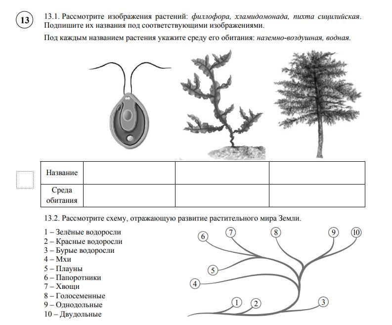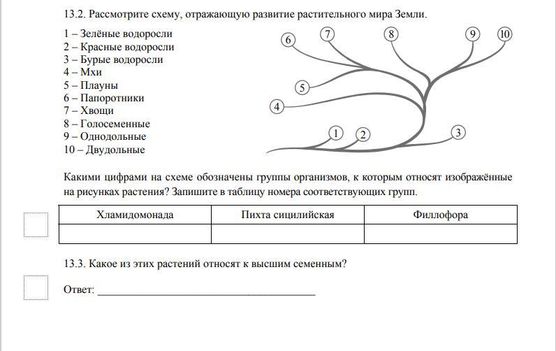 13.2)хламидомонада-1, пихта-8, филлофора-2