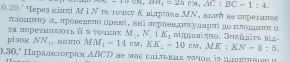 Через кінці M i N та точку К відрізка MN, який не перетинає площину а, проведено прямі, які перпендикулярні до площини с. та перетинають її в точках M, N, і к, відповідно. Знайдіть відрізок NN, якщо ММ 14 см, КК, 10 см, MK : KN = 3:5.