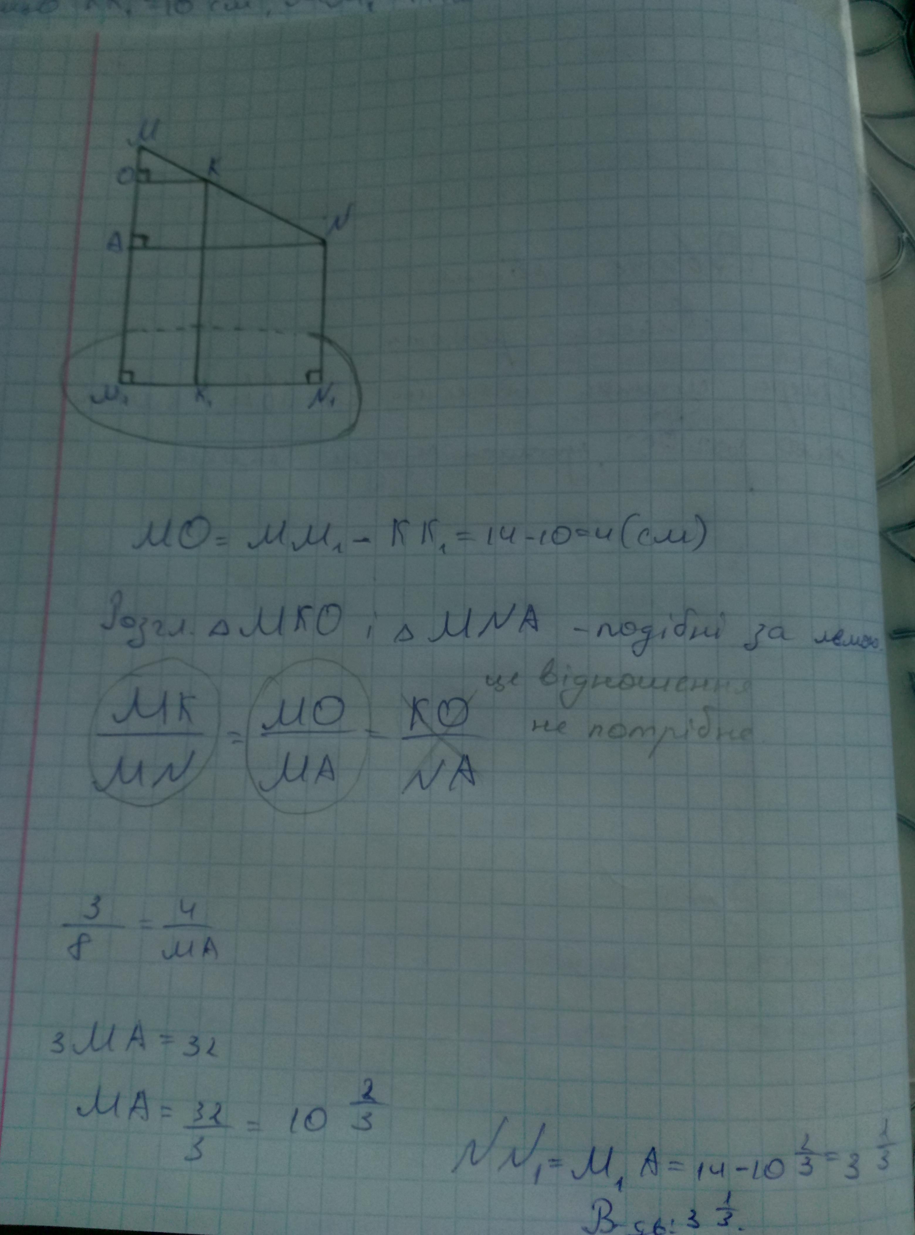 Спочатку добудовуємо дві висоти(з точки N та K).MM1=14 см,KK1=10,тому MO=MM1-KK1=14-10=4(см).Прямокутні трикутники MNA та MKO подібні за лемою,тому і їхнє відношення сторін буде однаковим.MK:MN=MO:MA,3:8(5 частинок+3 частинки)=4:MA.Звідси MA=10 2/3.NN1=14-10 2/3=3 1/3.