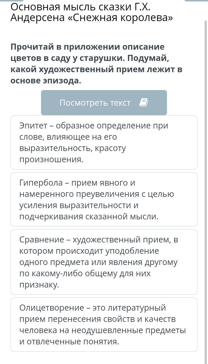 Основная мысль сказки Г.Х. Андерсена «Снежная королева» Эпитет – образное определение при слове, влияющее на его выразительность, красоту произношения. Гипербола – прием явного и намеренного преувеличения с целью усиления выразительности и подчеркивания сказанной мысли. Сравнение – художественный прием, в котором происходит уподобление одного предмета или явления другому по какому-либо общему для них признаку. Олицетворение – это литературный прием перенесения свойств и качеств человека на неодушевленные предметы и отвлеченные понятия.