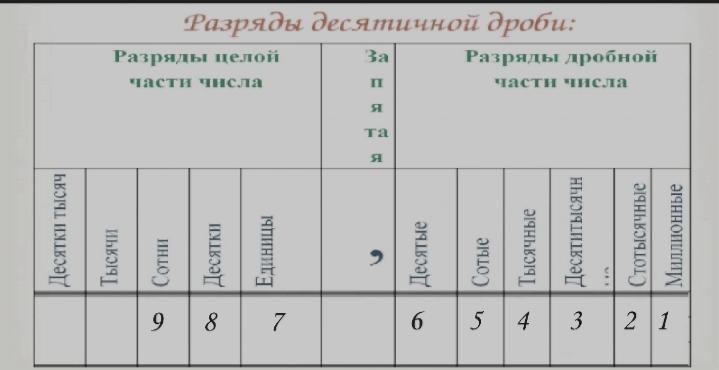дано число 987,654,321. Какая цифра записана в разряде, 1)сотых 2)десятых 3)тысячных 4)десятитысячных 5)стотысячных 6)миллионных с объяснением пж
