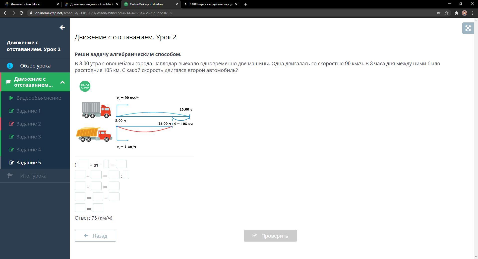В 8.00 утра с овощебазы города Павлодар выехало одновременно две машины. Одна двигалась со скоростью 90 км/ч. В 3 часа дня между ними было расстояние 105 км. С какой скорость двигался второй автомобиль?