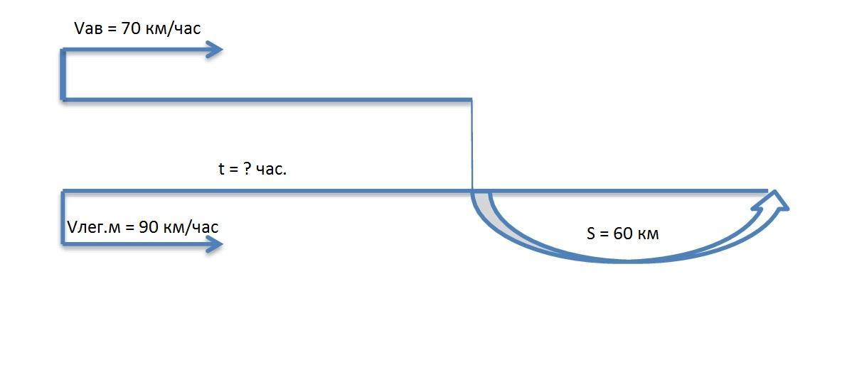 из одного населённого пункта одновременно выехали в одном направлении легковая машина со скоростью 90 км/ч и автобус со скоростью 70км/ч.через какое время расстояние между ними будет 60км? Составь чертеж к задаче