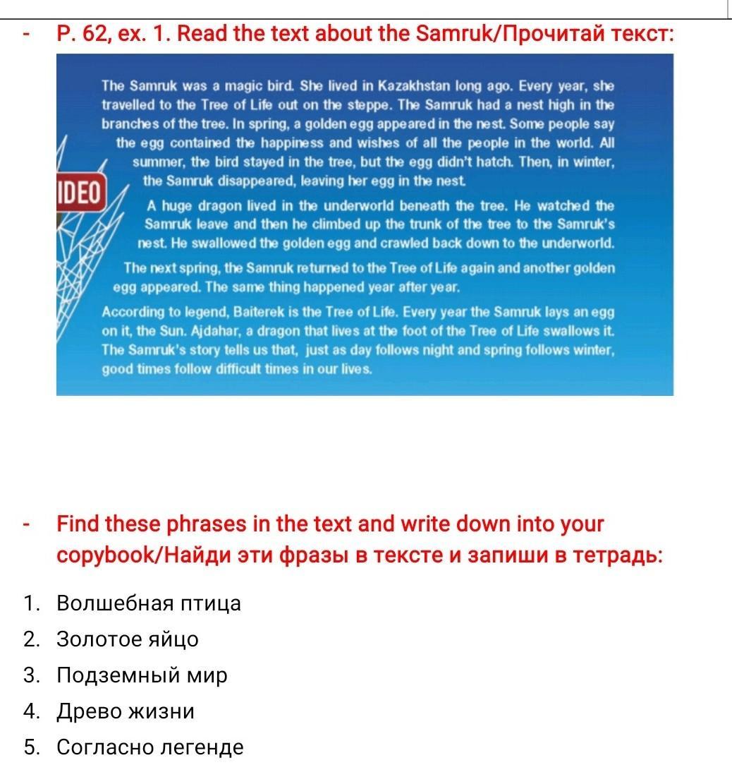 P. 62, ex. 1. Read the text about the Samruk/Прочитай текст: