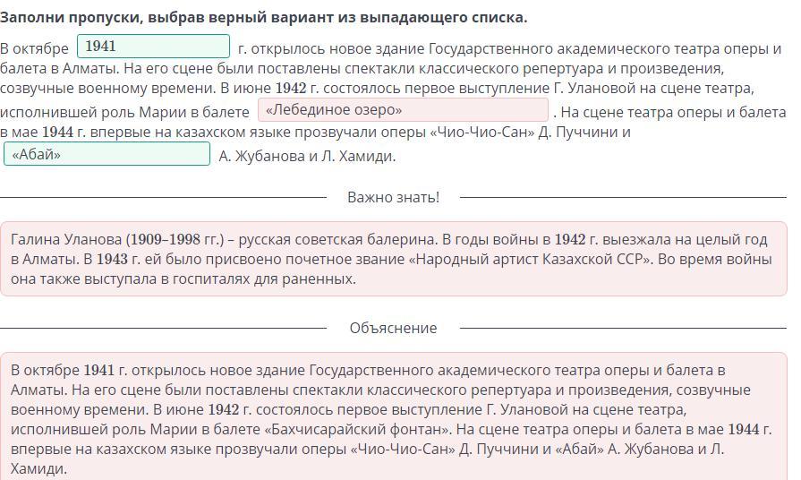В октябре (1937\1941) г. открылось новое здание Государственного академического театра оперы и балета в Алматы. На его сцене были поставлены спектакли классического репертуара и произведения, созвучные военному времени. В июне 1942 г. состоялось первое выступление Г. Улановой на сцене театра, исполнившей роль Марии в балете ("Бахчисарайский фонтан"/"Лебединое озеро") . На сцене театра оперы и балета в мае 1944 г. впервые на казахском языке прозвучали оперы «Чио-Чио-Сан» Д. Пуччини и