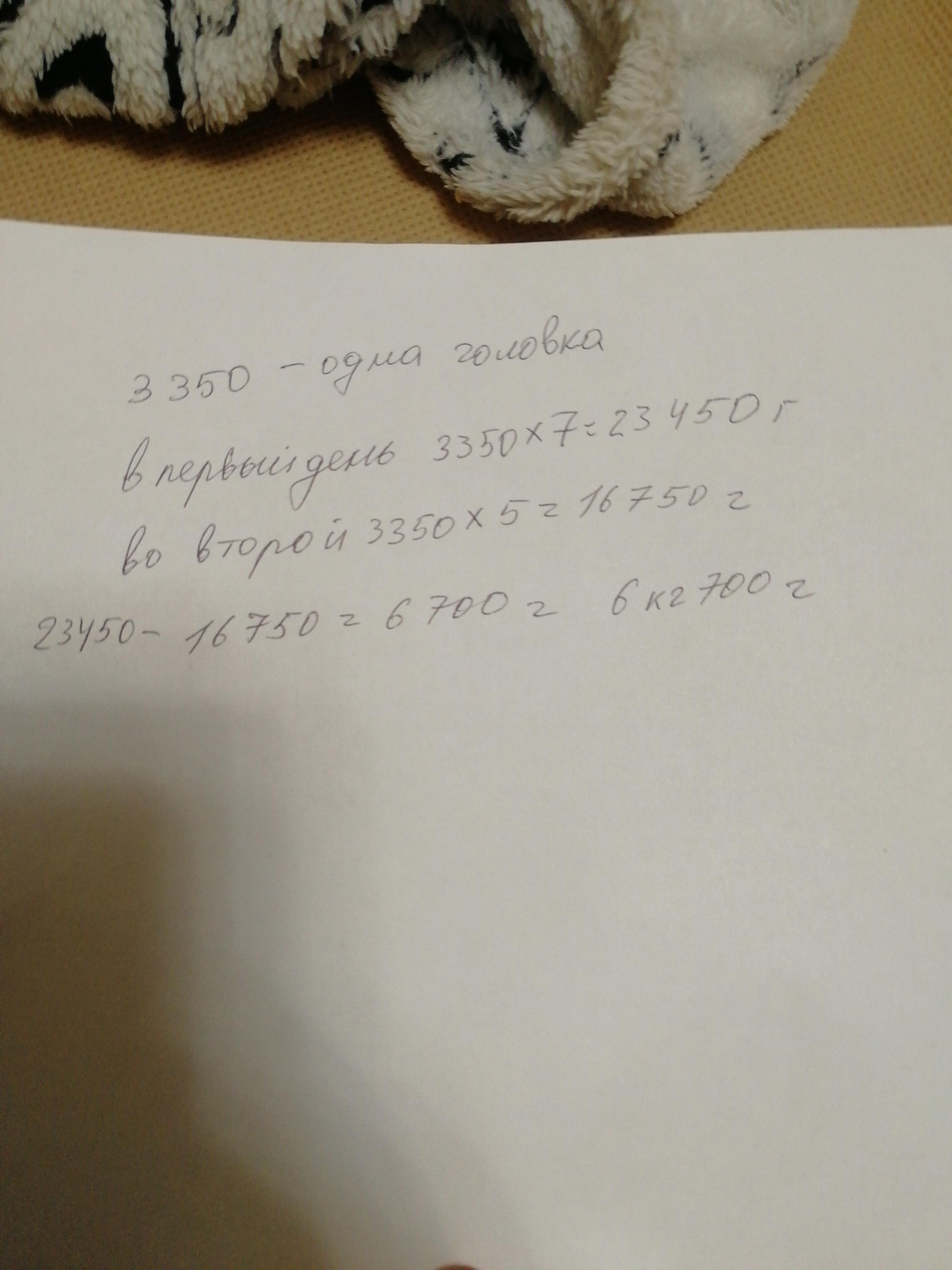 3.3350*2=6700=6кг 700г на столько меньше весит сыр, проданный во второй день.