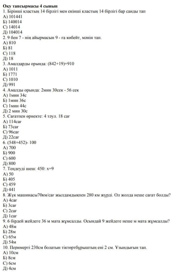 Учебное задание 4-й класс 1. Найдите число, состоящее из 14 единиц первого класса и 14 единиц второго класса A) 101441 B) 140014 C) 14014 D) 104014 2. Умножьте разницу между 9 и 7 на 9, найдите значение: A) 810 B ) 81 C) 118 D) 18 3. Выполните операции: (842 + 19 910 A) 1011 B) 177 C) 1010 D) 991 4. Выполните операции: 2min 30sec - 56 sec A) 1min 34c B) 1min 36c C) 1 мин 44 с D) 2 мин 30 с 5. В часах: 4 дня. 18 часов A) 114 автомобилей B) 73 год C) 96 автомобилей D) 22 часа 6. (548 + 452) - 100 A) 700 B) 900 C) 600 D) 800 7. Решите уравнение: 450: x = 9 A) 50 B) 405 C) 459 D) 441 8. Грузовик проезжал 280 км со скоростью 70 км / ч. Сколько часов он был в дороге? A) 4car B) Zcar C) 2car D) Icar 9. На 6 одинаковых рубашек было использовано 36 м ткани. Сколько метров ткани было потрачено на 9 таких рубашек? A) 48M B) 28м C) 65M D) 54м 10. Ширина прямоугольника с периметром 230 см составляет 2 см. Найдите длину. A) 10 см B) 8 см C) 6 см D) 4 см