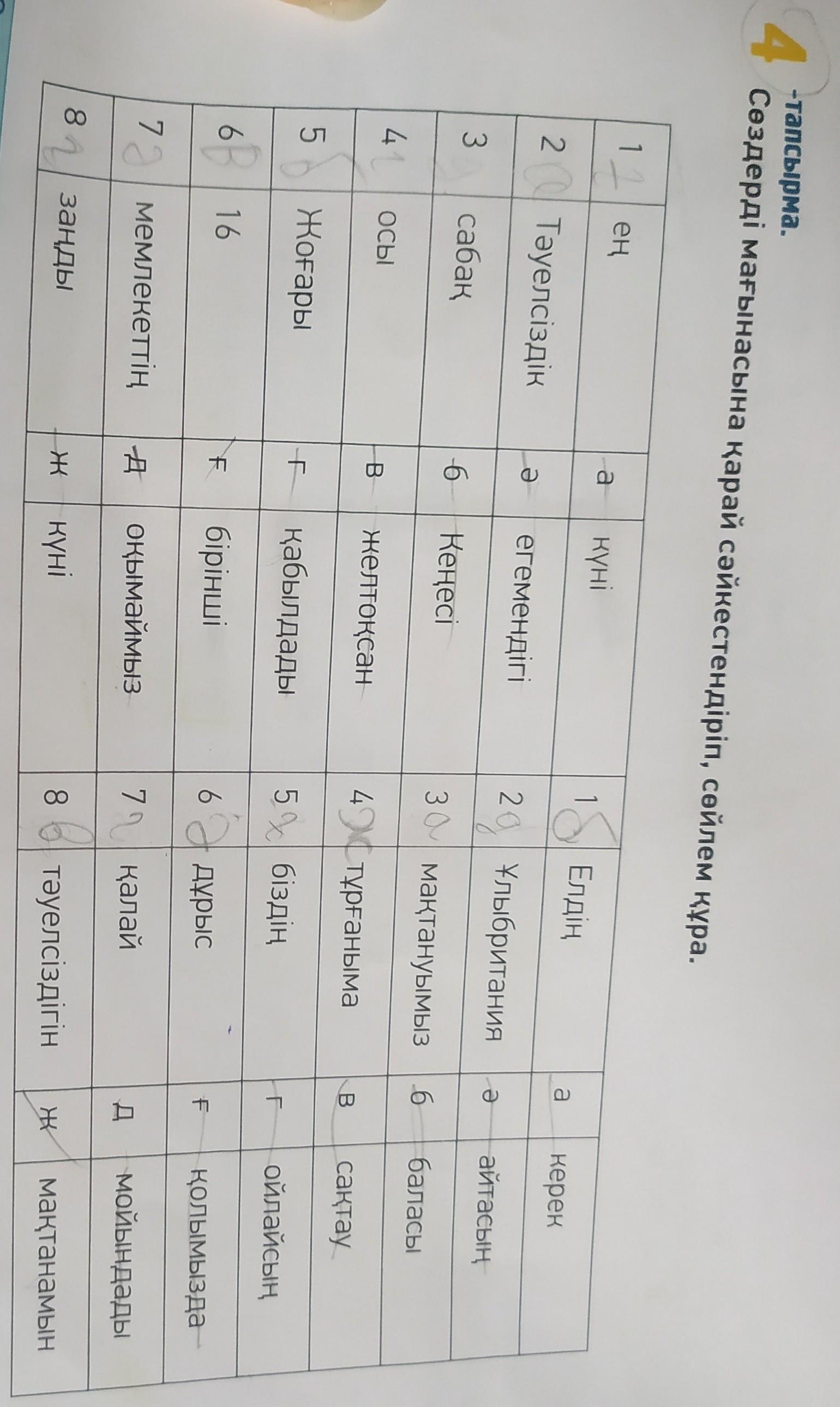 Сөздерді мағынасына қарай сәйкестендіріп, сөйлем құра.