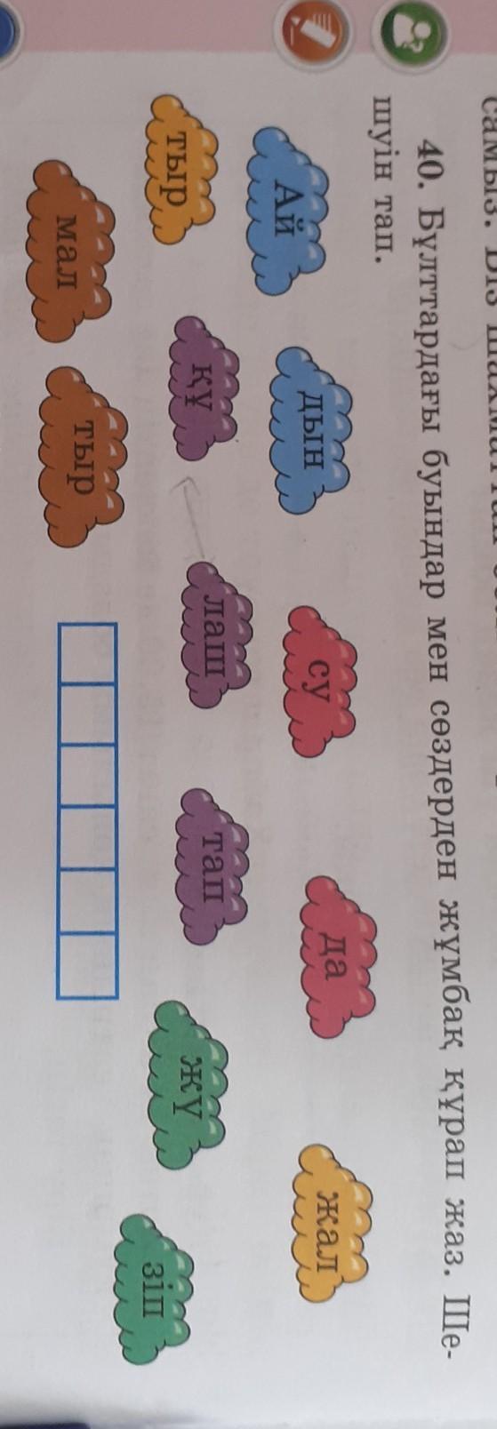 40. Бұлттардағы буындар мен сөздерден жұмбақ құрап жаз. Ше