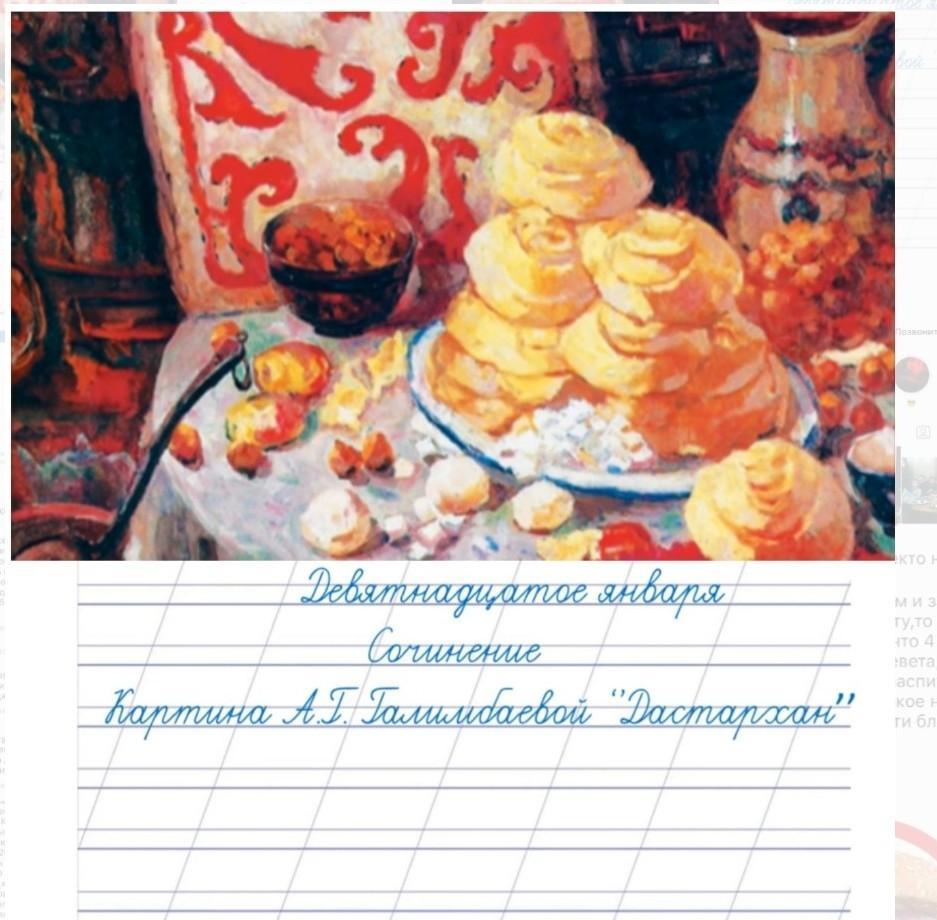 Картина "Дастархан" передаёт ценности культуры Казахстана. А именно это передаётся через на крытый стол. Скорее всего этот стол был накрыт для гостей, это говорит о щедрости народа. Так же наличие традиционных орнаментом указывает на то что автор картины гордится достоянием своего народа. Выделяются тёплые краски что приводят атмосферу домашнего уюта.