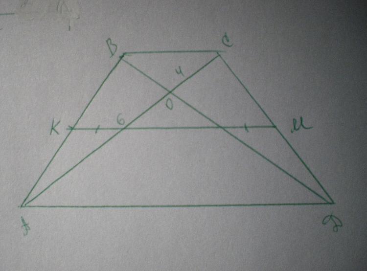у трапепії АВСД (ВС паралельно АД) м -точка перетину діагоналей, ВМ : МД =1:3 , асередня лінія трапеції дорівнюе 8см. знайдіть основи