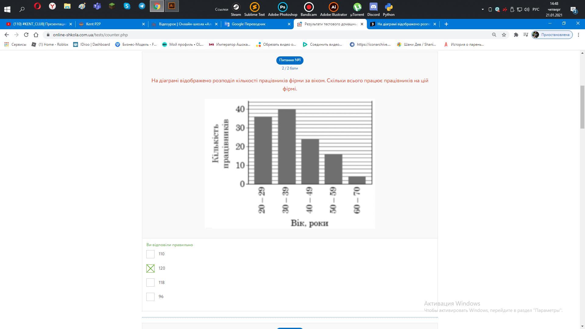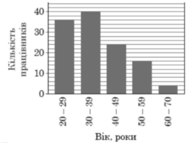 На діаграмі відображено розподіл кількості працівників фірми за віком. Скільки всього працює працівників на цій фірмі.