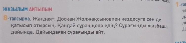 8-тапсырма. Жағдаят: Досқан Жолжақсыновпен кездесуге сен де қатысып отырсың. Қандай сұрақ қояр едің? Сұрағыңды жазбаша дайында. Дайындаған сурағынды айт. Өтінем маған көмектесініз