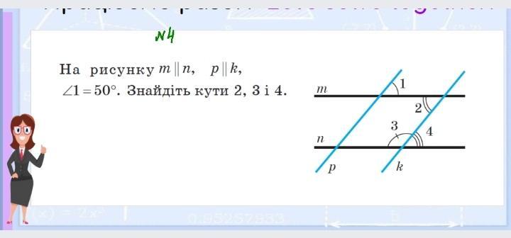 Представим что p и k - те самые параллельные, а m - секущая, тогда 1 и 2 накрест лежащие и они равны, дальше рассмотрим m и n как параллельные и k как секущую, 2 и 4 равны т.к. они накрест лежащие, а угол 3 равен 180 - 50, так как сумма односторонних - 180.
