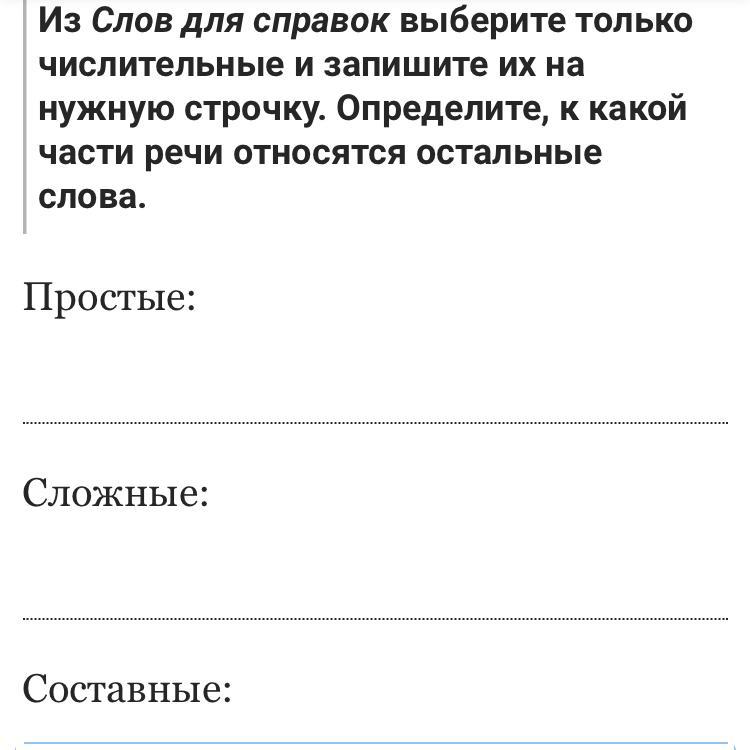 Слова для справок: тройной, тринадцать, триста, тридцать три, утроить; шестиугольник, шестой, шестьдесят, шестьдесят шесть, шестнадцать, шестизначный; десятибалльный, десяток, десять, сто десять; сотенный, сотый, столетний, сто, сто пятьдесят пятый.