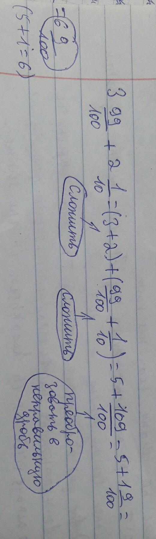 3 99/100+2 1/10= 3 99/100+2 10/100= 5 109\100=6 9\100
