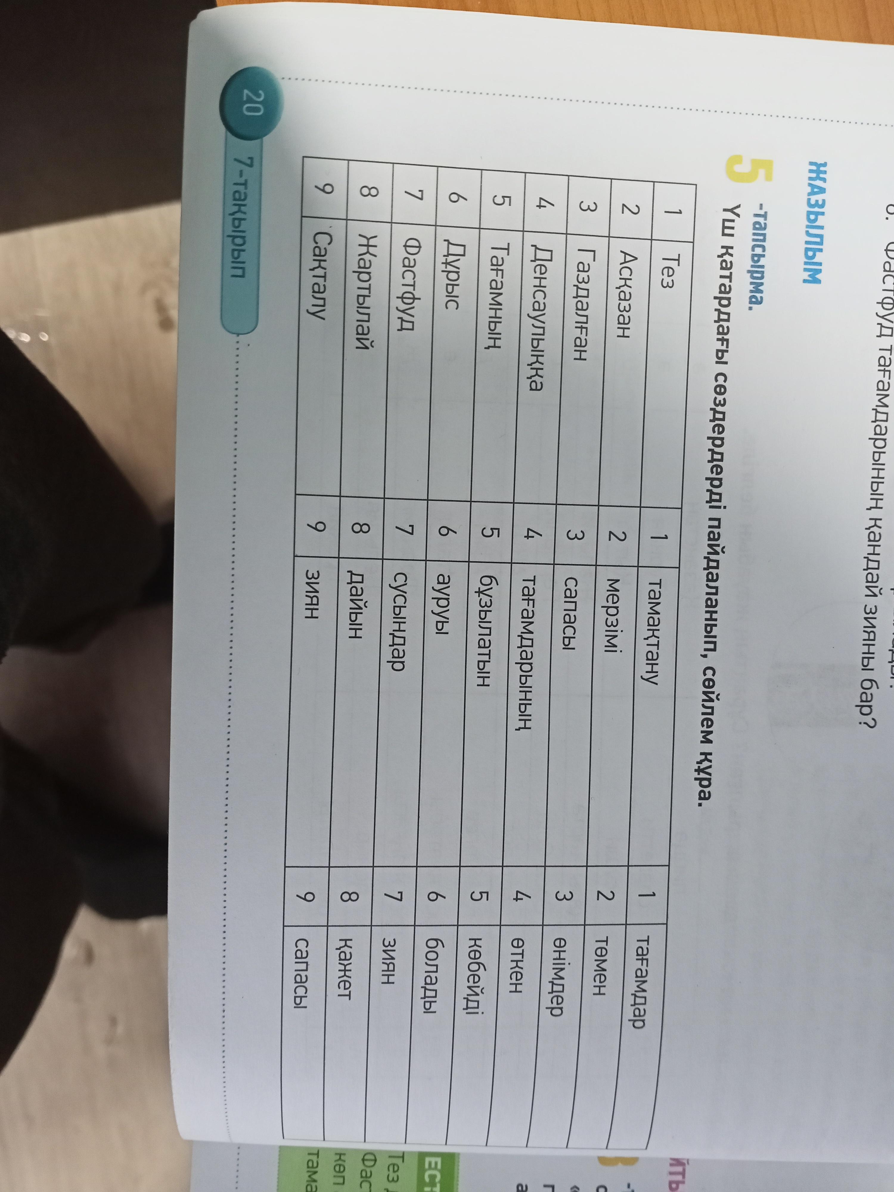 Ответ:Фастфуд тагамдарын кандай зияны бар? Тамактанудын мерзими барма? Объяснение:Если не правильно ты прости.