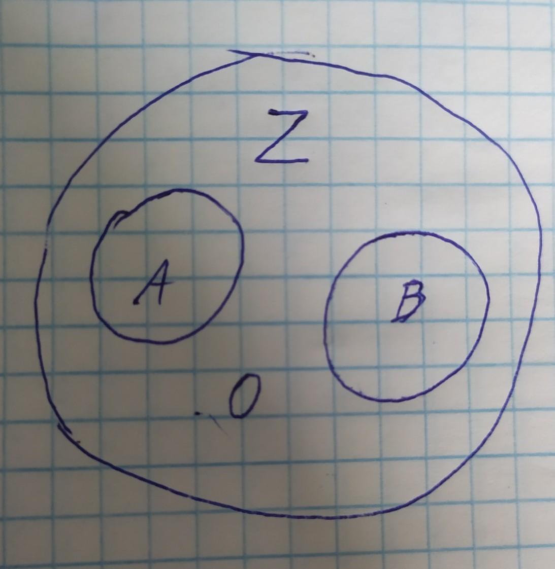Z - множество целых чисел, A - множество целых отрицательных чисел, B - множество целых положительных чисел. Изобразите эти множества при помощи диаграмм Эйлера-Венна. Какому множеству принадлежит нуль?
