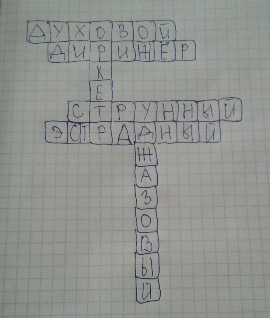 Надо составить кроссворд в середине должен стоять оркестр, а потом дирижёр ,духовой, струнный, джазовоый и эстрадный