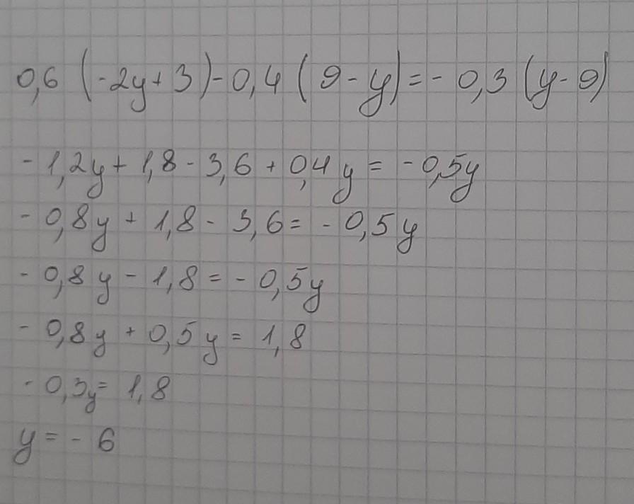 0,6(-2y+3)-0,4(9-y)=-0,3(y-9)