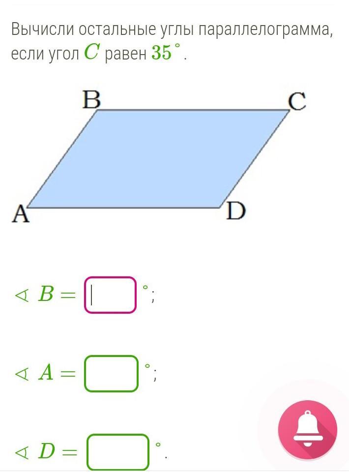 Вычисли остальные углы параллелограмма, если угол C равен 35°.