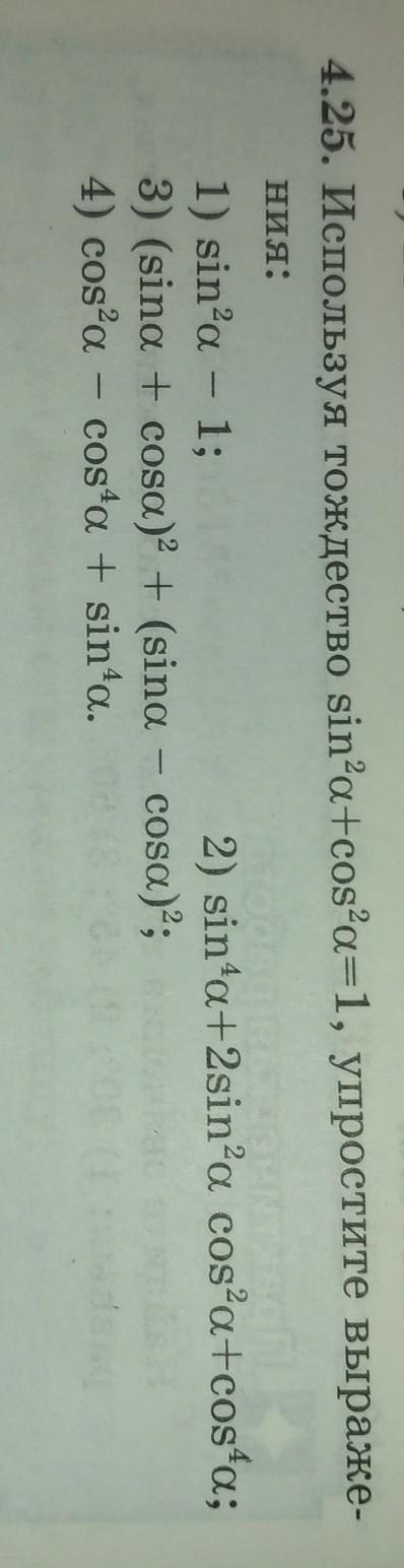 Используя тождество sin²a+cos²a=1 ,упростите выражения:1)sin²a-1. 2) sin⁴a+2sin²a cos⁴a.3)(sina+cosa)²+(sina-cosa)².4)cos²a–cos⁴a+sin⁴a.