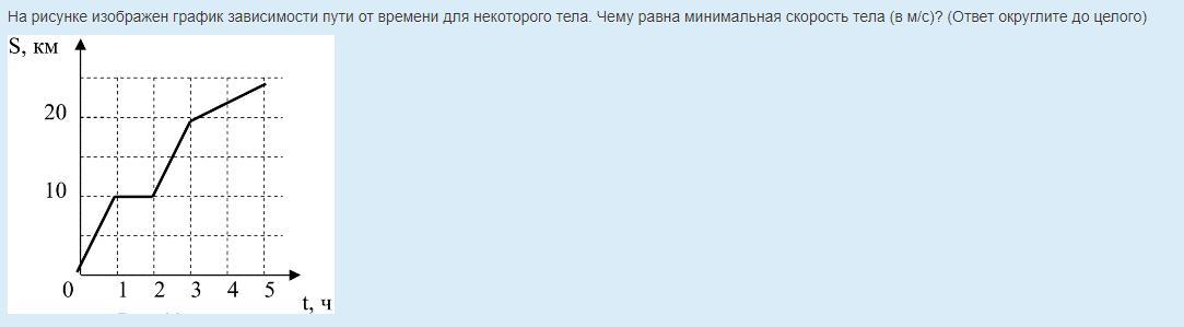 На рисунке изображен график зависимости пути от времени для некоторого тела. Чему равна минимальная скорость тела (в м/с)? (Ответ округлите до целого)