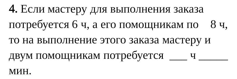 Ответ: 2 часа 24 мин.1/6+1/8+1/8=5/12 производительность мастера и двух помощников.