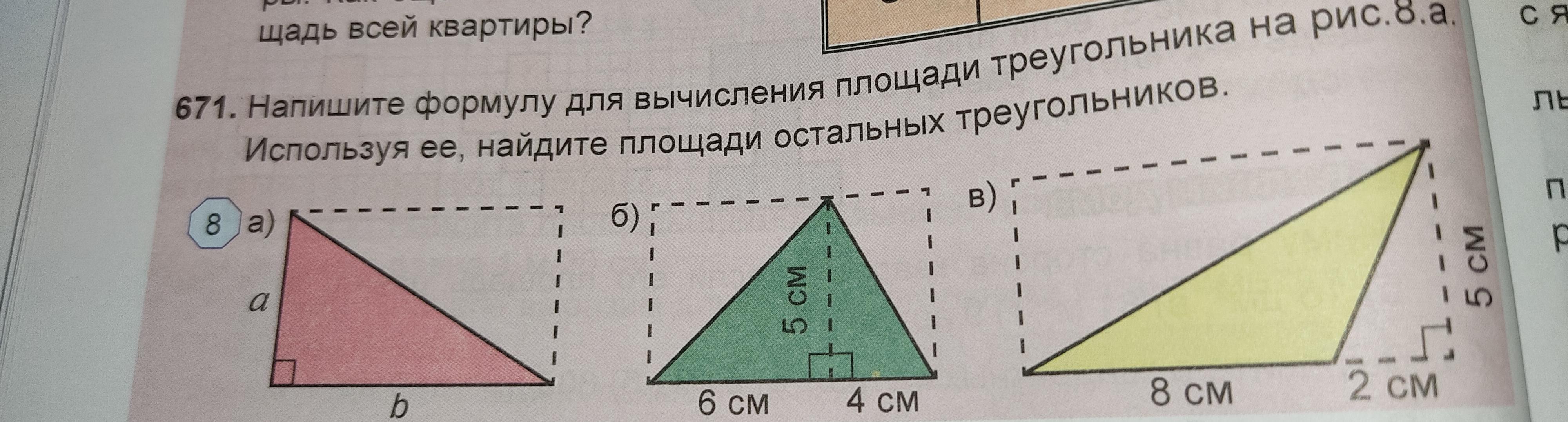 Напишите формулу для вычисления площади треугольника на рис 8.a. Используя её, найдите площади остальных треугольников