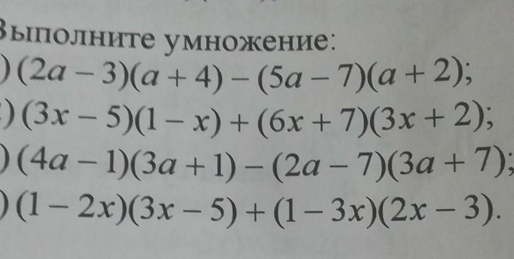 (4а - 1) (3а + 1) - (2а - 7) (3а + 7) = 12а² + 4а - 3а - 1 - (6а² + 14а - 21а - 49) = 12а² + 4а - 3а - 1 - (6а² - 7а - 49) = 12а² + 4а - 3а - 1 - 6а² + 7а + 49 = 6а² + 8а + 48