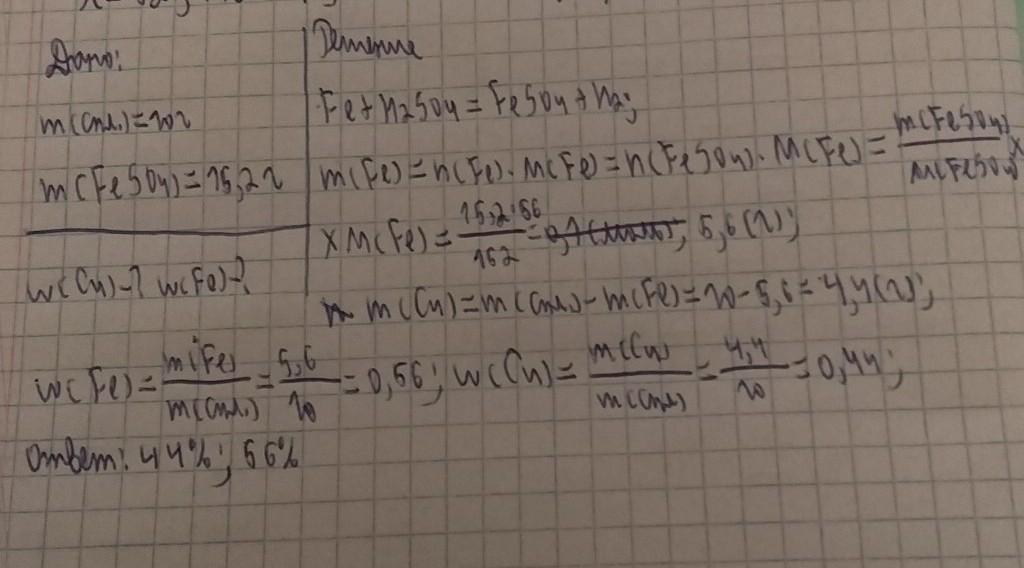 сплав массой 10г состоящий из железа и меди обработали раствором H2SO4 . определить массовые доли элемента в сплаве если в результате реакции образовались 15.2г сульфата Fe04