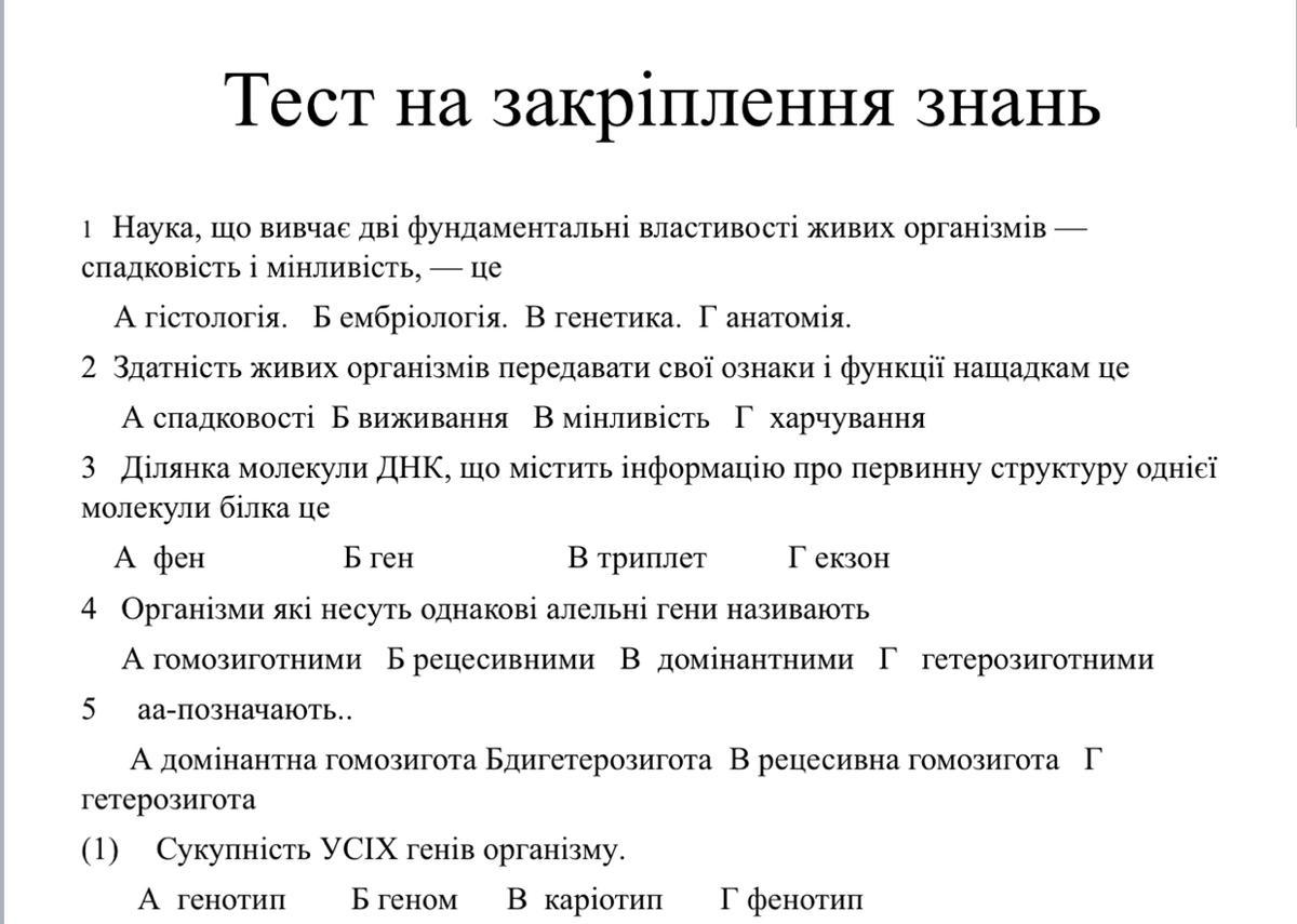 1 Наукою, яка вивчає дві основні властивості живих організмів, спадковість та мінливість, є гістологія А. Бембріологія. В генетиці. G анатомія. 2 Здатність живих організмів передавати свої ознаки та функції потомству - це спадковість B виживання B мінливість D харчування 3 Частина молекули ДНК, що містить інформацію про первинну структуру однієї молекули білка, - це фен B, триплет гена Hexon 4 Організми, що несуть однакові алельні гени, називаються A гомозиготним B рецесивним B домінантним D гетерозиготним 5 aa-позначають .. Домінантний гомозигот Bdiheterozygote B рецесивним гомозиготним G гетерозиготом (1) Набір ВСІХ генів в організмі. A генотип B геном B каріотип Gphenotype