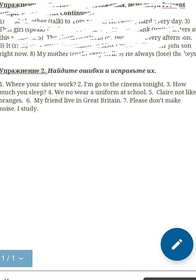 1.Where does your sister work? 2. I'm going to the cinema tonight. 3.How much do you sleep? 4.We don't wear an uniform at school. 5. Claire doesn't like oranges.6.My friend lives in Great Britain. 7. Please, don't make noise. I am studying.