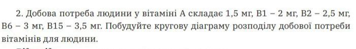Суточная потребность человека в витамине А составляет 1,5 мг, В1- 2 мг, В2-2,5 мг, В6 3 мг, В15 -3,5 мг. Постройте круговую диаграмму распределения суточной потребности витаминов для человека. ответ: