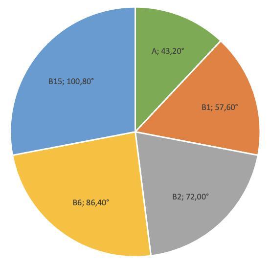 Витамин B6: α₄ / 360° = 3 / 12,5 ⇒ α₄ = 360°·(3 / 12,5) = 86,4°.