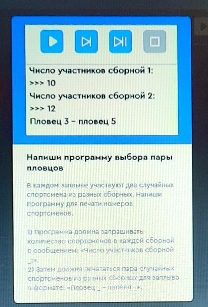 print("Пловец", rand_team1, "- пловец", rand_team2)