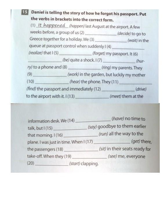 It happened last August at the airport. A few weeks before, a group of us had decided to go to Greece together for a holiday. We were waiting in the queue at passport control when suddenly I realized that I had forgotten my passport. It was quite a shock. I hurried to a phone and rang my parents. They were working in the garden, but luckily my mother heard the phone. They found the passport and immediately drove to the airport with it. I met them at the information desk. We had no time to talk, but I had said goodbye to them earlier that morning. I ran all the way to the plane. I was just in time. When I got there, the passengers were sitting in their seats ready for take-off. When they saw me, everyone started clapping.